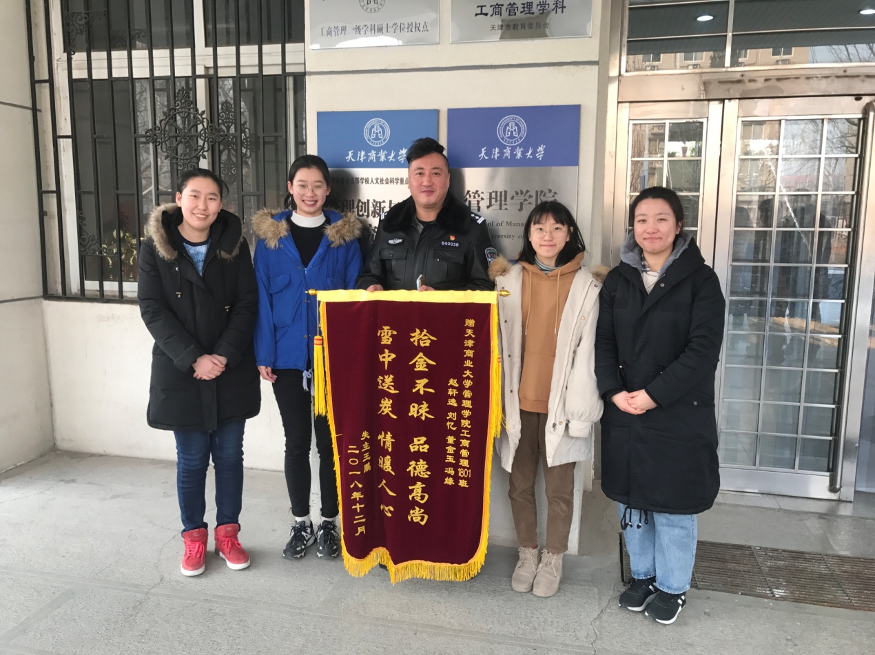 12月28日晚,bevictor1946韦德官网工商管理类1801 班赵轩逸、刘忆、董金玉、冯源四名同学,在校外乘坐出租车时捡到一个皮包,内有证件、银行卡等贵重物品及近1万元现金。返校后,她们立即报警,将拾到的物品原样交给佳荣里派出所。当晚11点多,警方联系到失主,并将物品奉还。