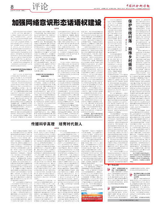 2019年3月5日,国内权威报刊《中国社会科学报》评论版刊发王庆生、张行发的乡村振兴资政文章。乡村振兴战略是习近平同志2017年10月18日在党的十九大报告中提出的战略。十九大报告指出,农业农村农民问题是关系国计民生的根本性问题,必须始终把解决好“三农”问题作为全党工作的重中之重,实施乡村振兴战略。中共中央和国务院最新出台的《乡村振兴战略规划(2018-2022)》明确指出,传统村落是彰显和传承中华优秀传统文化的重要载体,统筹保护、利用与发展的关系,努力保持村庄的完整性、真实性和延续性。要合理利用村庄特色资源,发展乡村旅游和特色产业。