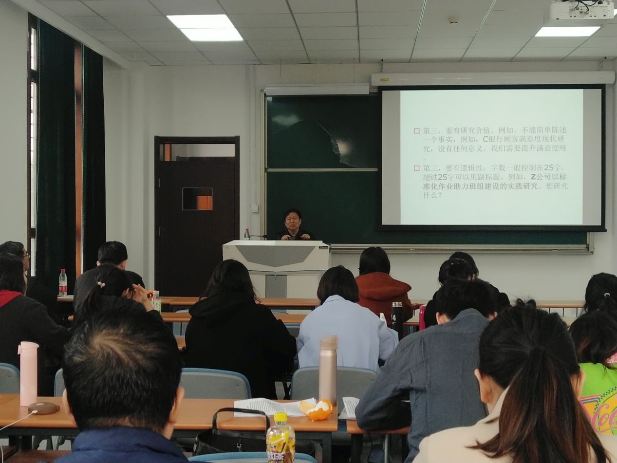 韦福祥教授从“如何选题和确定题目、如何写摘要、 如何选取关键词 、如何选取研究方法、如何写研究结论”等方面为师生作了精彩讲座。