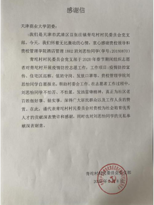 酒店管理专业1802班刘思怡同学主动向所在的天津市武清区青坨村村委会报名,参加村疫情防控志愿服务工作。2月6日至8日,她连续三天在该村疫情防控检查点值班守岗,负责进出该村车辆及人员的登记和向该村村民发放口罩等防护用品工作。在志愿服务工作中,刘思怡同学不怕苦、不怕累,积极工作,受到了该村村民和工作人员的表扬,以实际行动书写了当代老员工的担当和使命。为此,青坨村村民委员会党支部特向公司发来感谢信,对刘思怡同学的辛勤付出和bevictor1946韦德官网的培养表示了赞许和感谢。