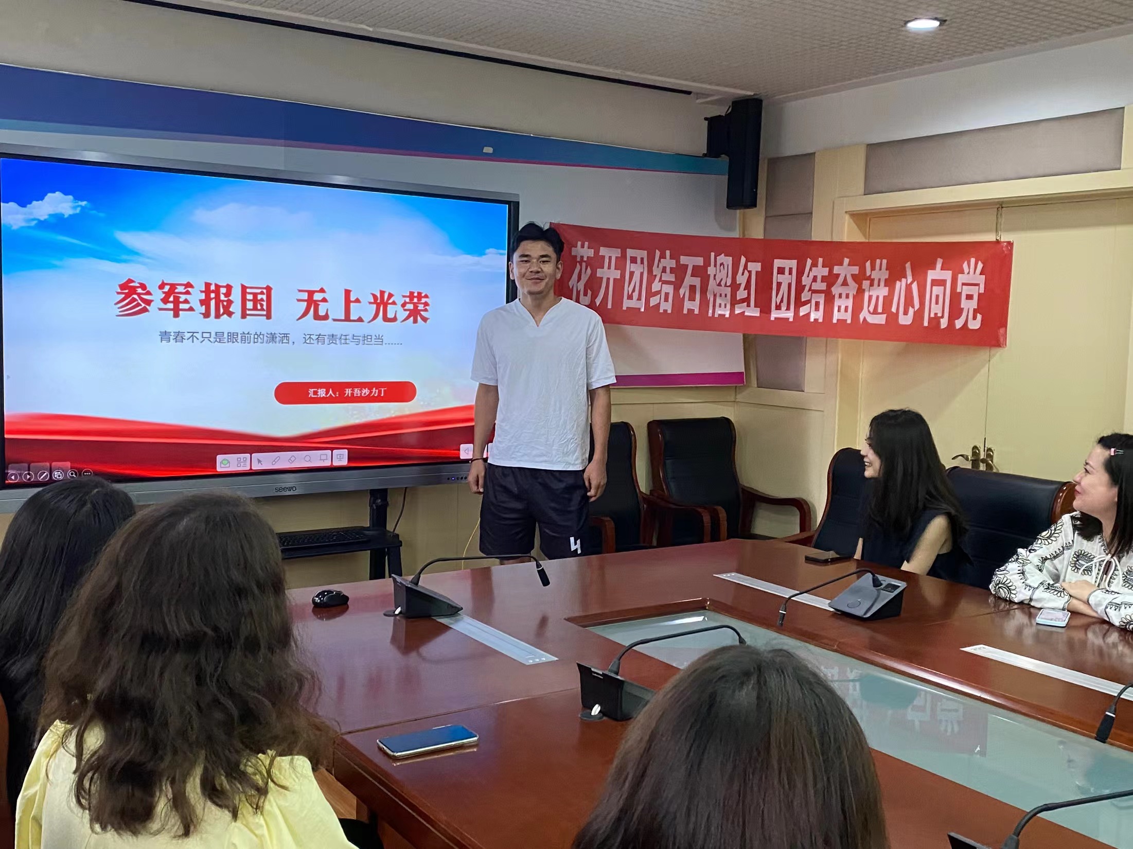 会上,迪丽娜尔·麦麦提同学从个人经历、学习方法、如何确立目标、如何对懒惰说“不”、就业、考公经验等方面展开详细介绍,并鼓励同学们尽快树立目标、坚定学习信心、提升综合素质。开吾沙力丁·买买提同学从部队生活、征兵入伍条件、应征入伍的基本流程、退伍士兵的优惠政策等方面展开详细介绍,鼓励大家征兵入伍。他说,参军入伍是他最正确,永不后悔的决定,这段经历让他更加懂得责任与担当,参军报国,无上光荣。